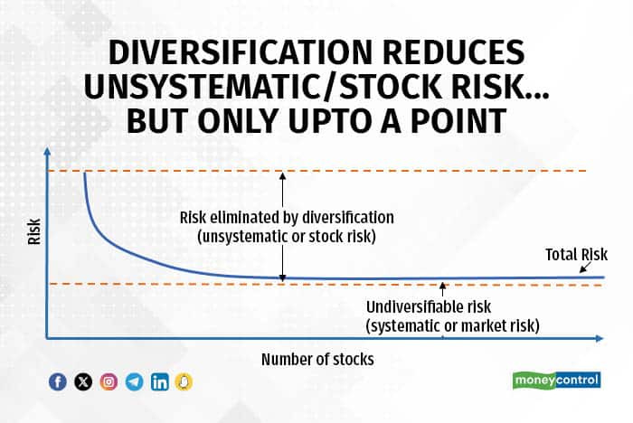 If you only have 1 stock, adding a second one does spread out the risk, but the benefits of adding more decay quickly.