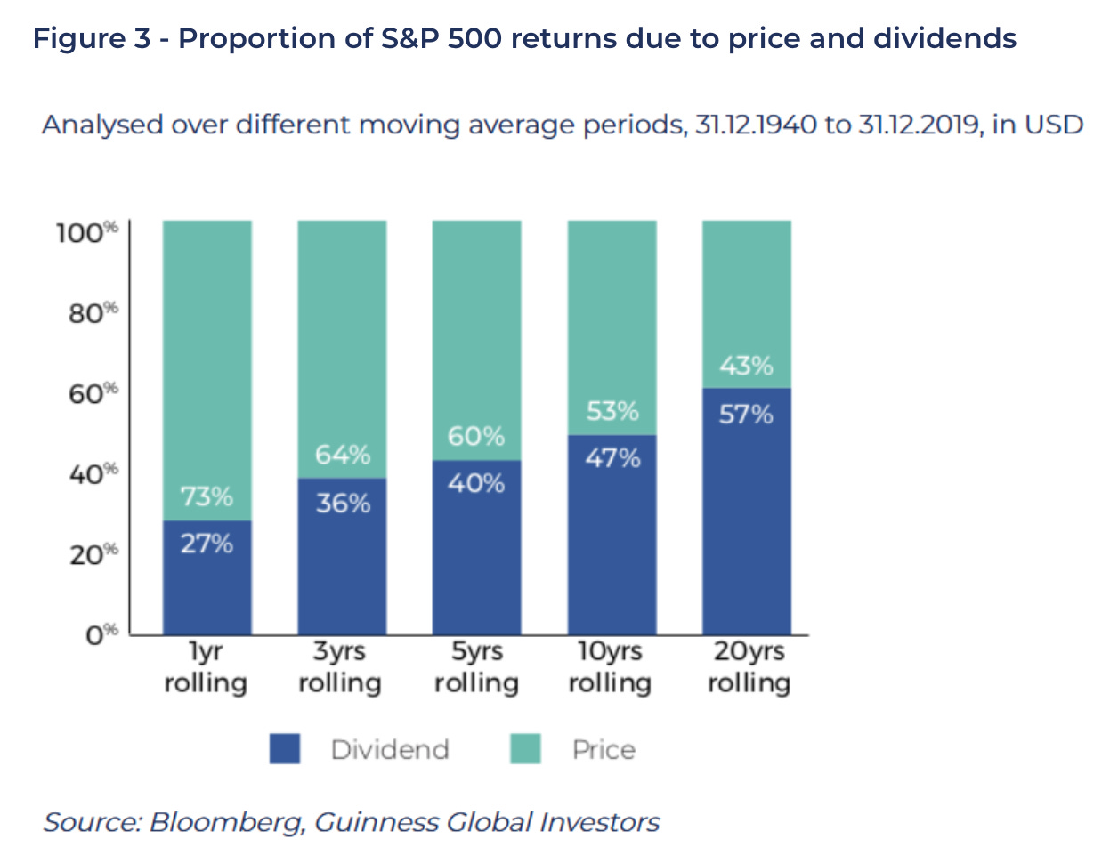 The image shows that the longer youâre invested, the more dividends contribute to your returns.