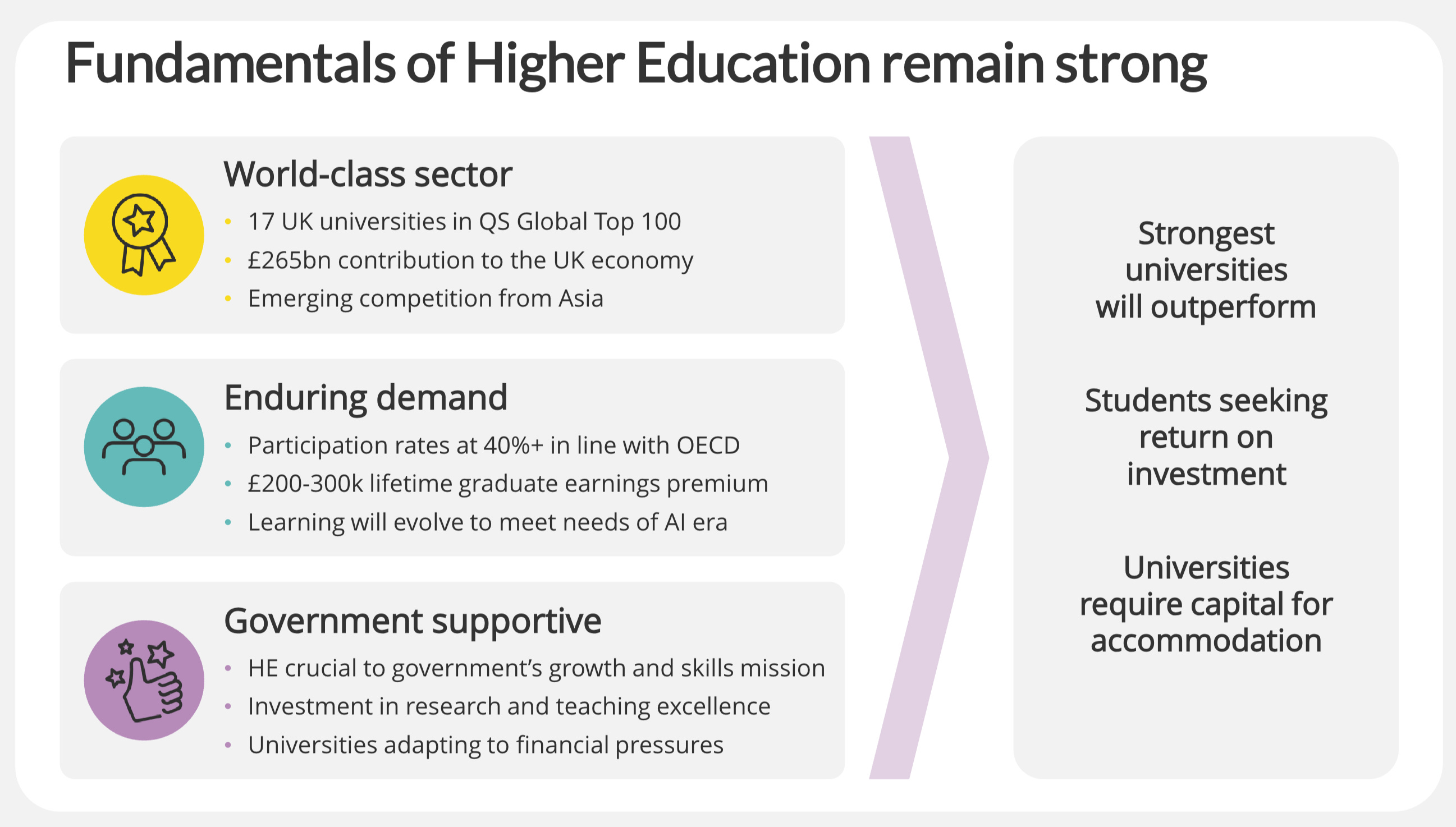 Supply-Demand Gap: There is a chronic shortage of high-quality student housing in the UK, leading to high occupancy rates and reliable rent growth.