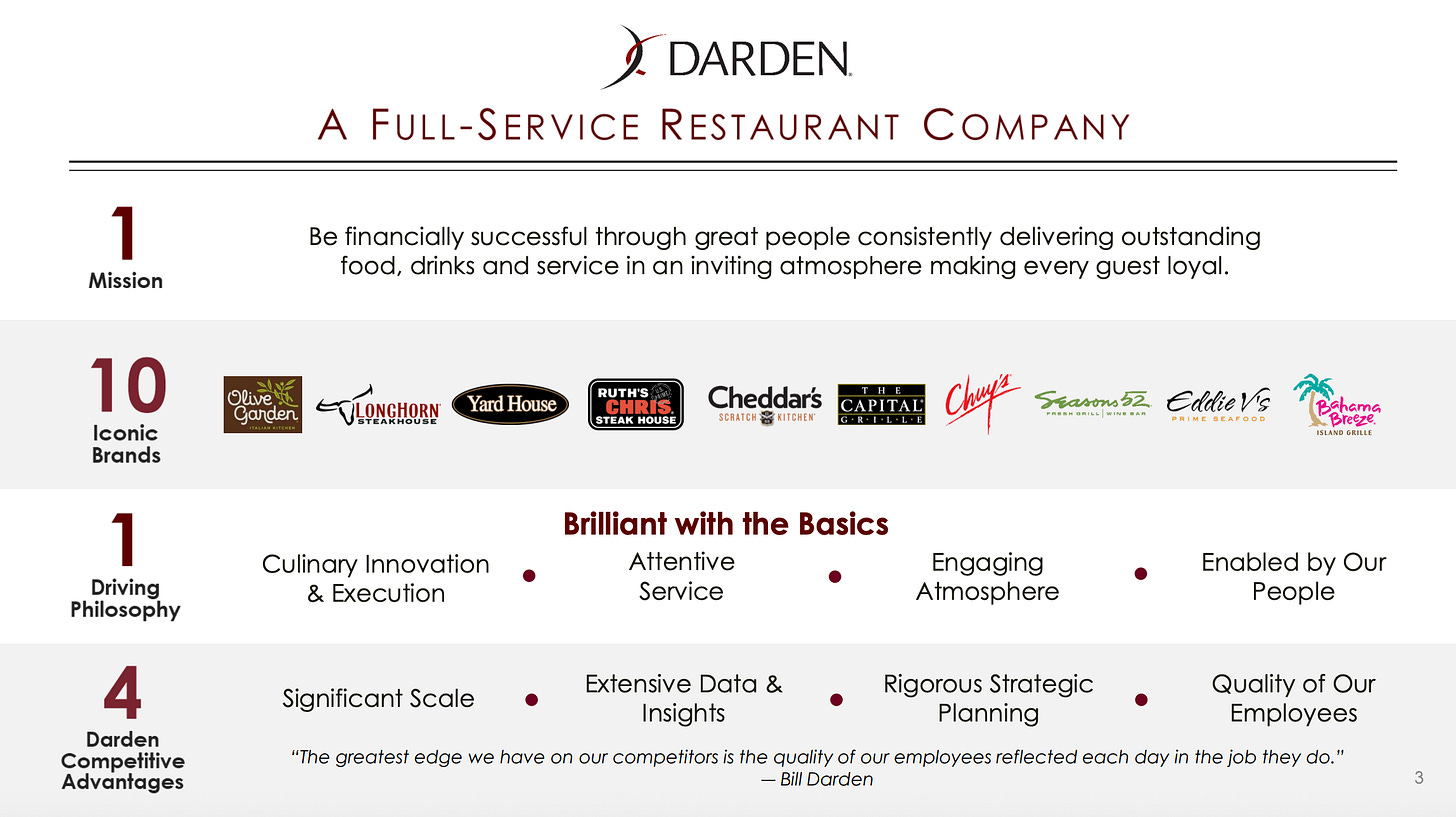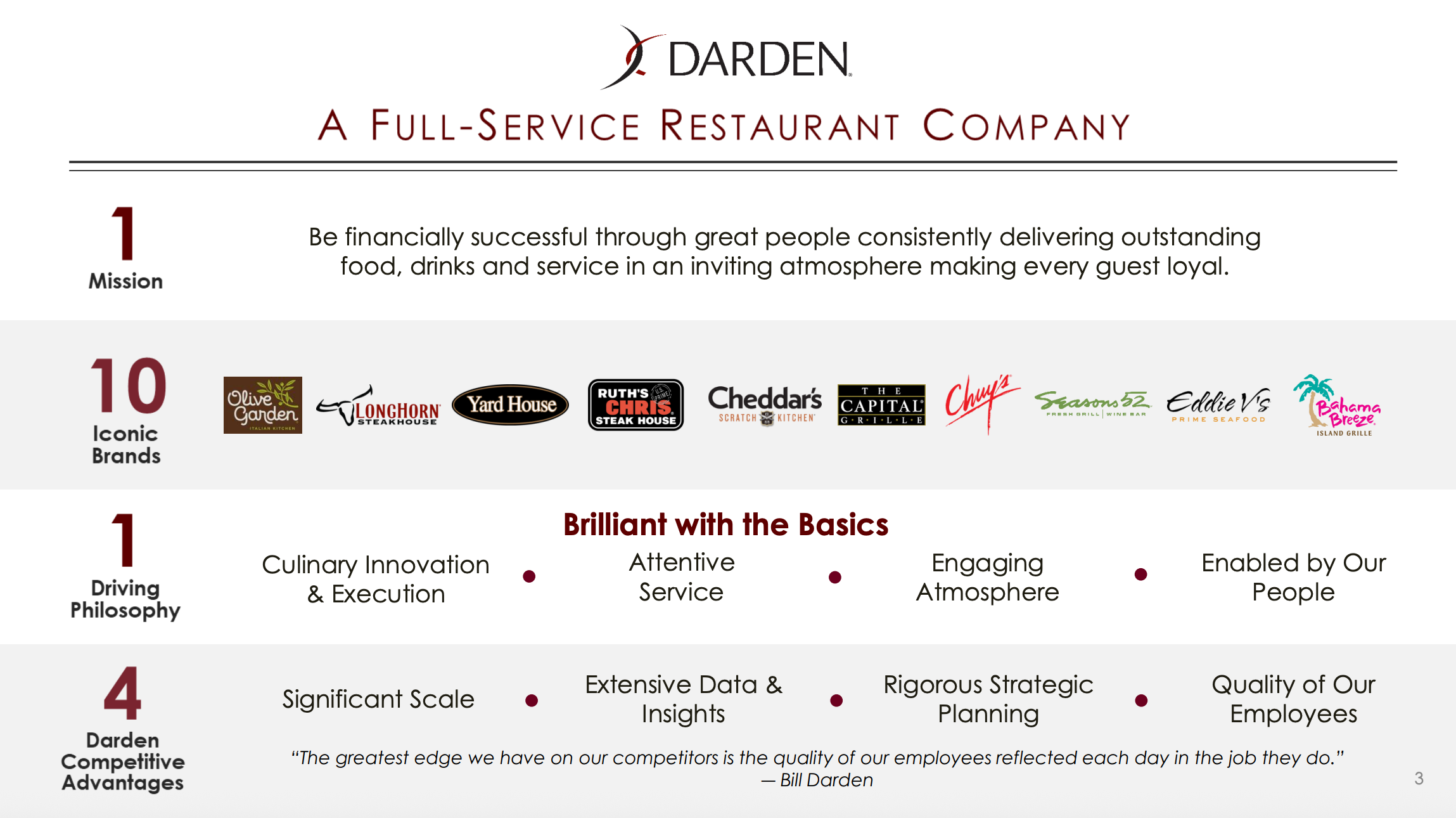 Darden is the owner of some of the most recognizable names in casual dining, including Olive Garden, LongHorn Steakhouse, and the recently acquired Ruth’s Chris Steak House.