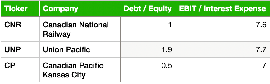 Canadian National and Canadian Pacific also earn points for their Debt/Equity ratios.