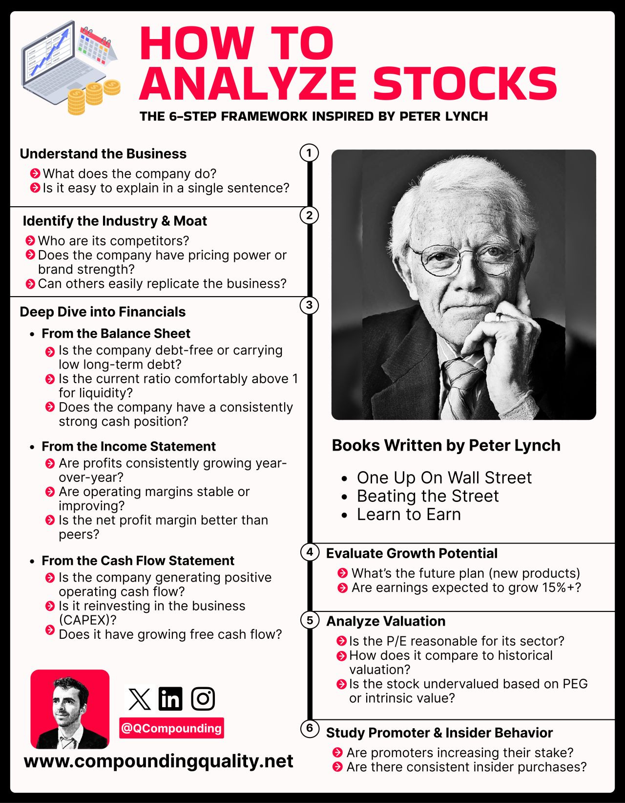 His approach? Buy what you understand, focus on fundamentals, and ignore the noise. This 6-step framework captures his timeless wisdom in one graphic.