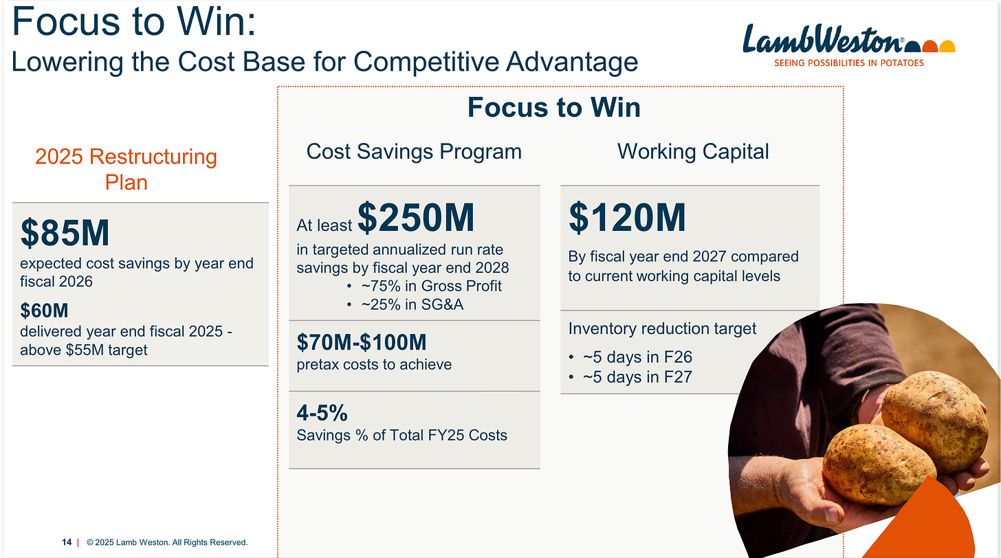Lamb Weston is the largest producer of frozen potato products in North America and the second-largest globally. They primarily sell french fries, sweet potato fries, and tater tots to restaurants and retailers.
