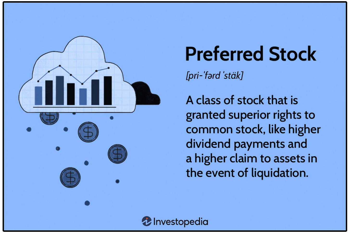 Preferred shares are higher in the capital stack than common stock but lower than debt (in a bankruptcy, debt holders are paid first, then preferred shareholders, then common shareholders)