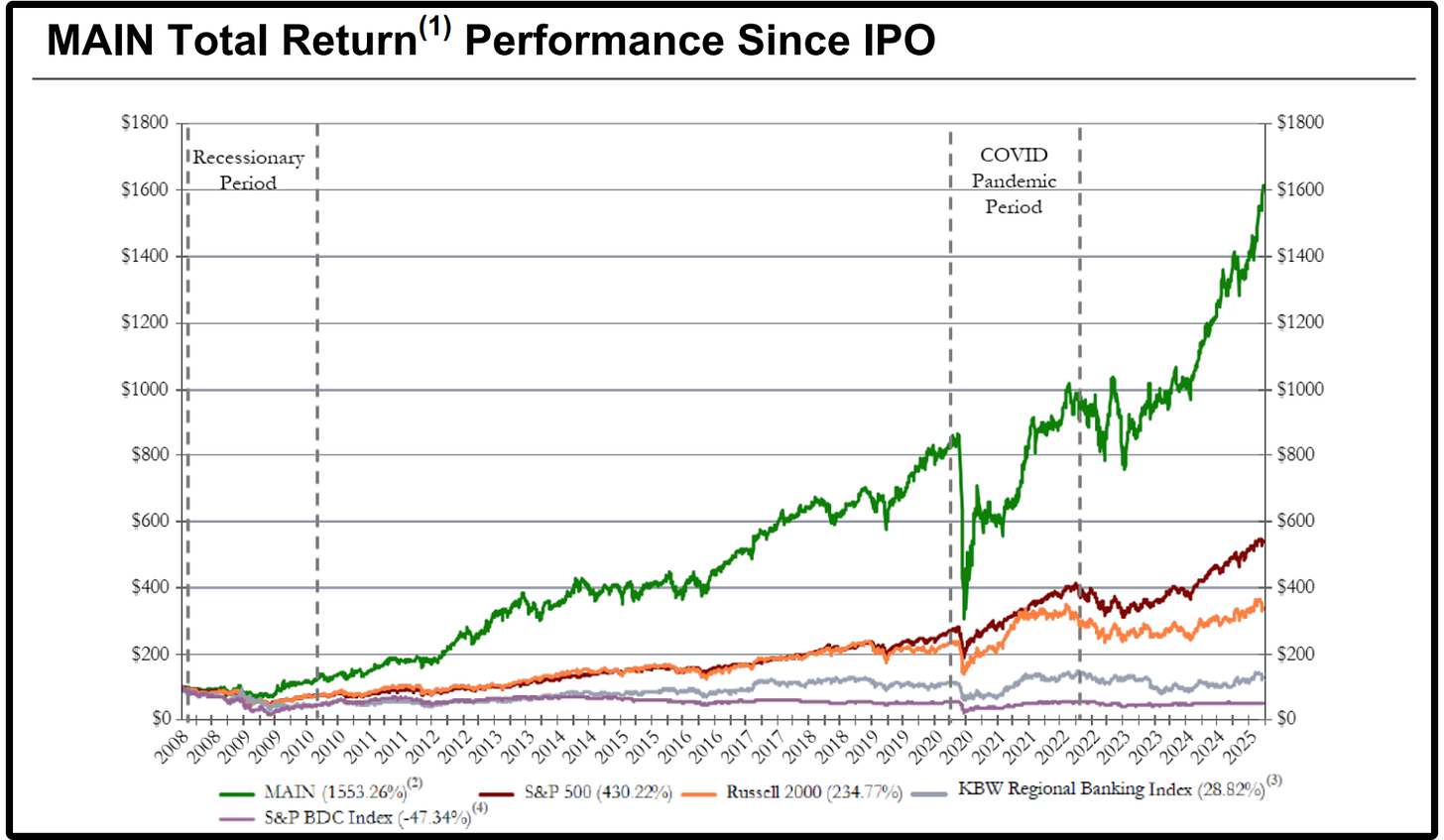 Since their IPO in 2008, they have had a total return of 1,553%, vs the S&P BDC index sitting at -47.34%.