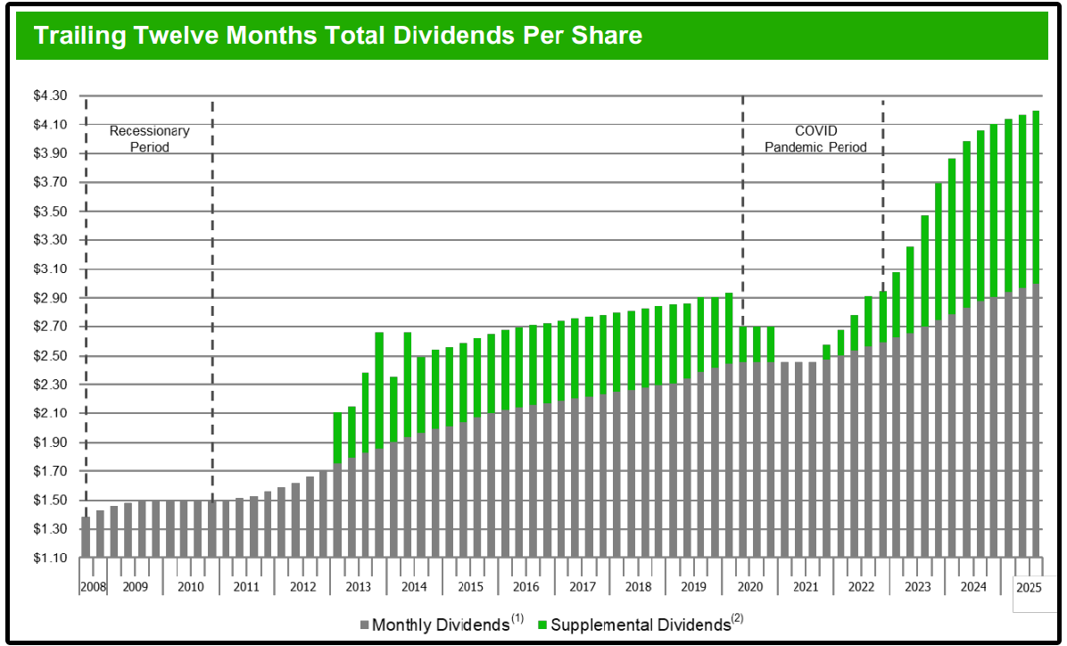 The company is known as “The Monthly Dividend Company” because it generates highly predictable rental income from long-term leases-