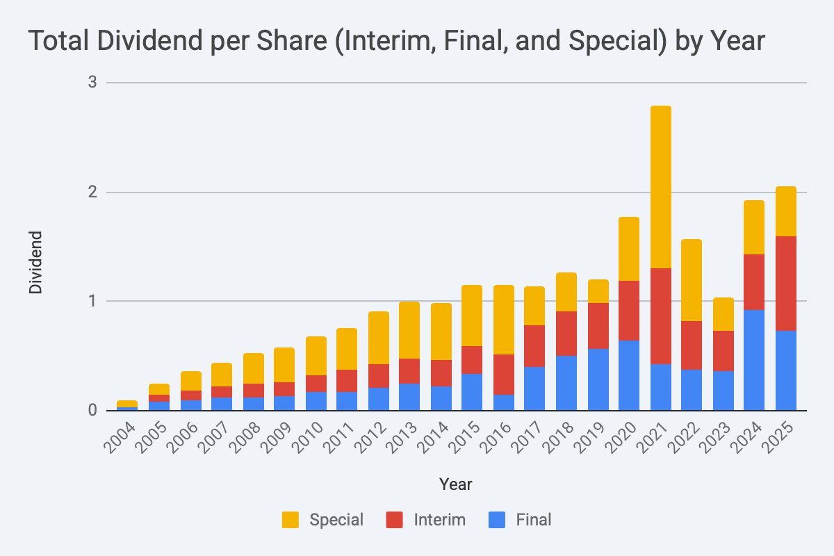 They pay regular dividends 2x per year, but also return extra capital via special dividends.