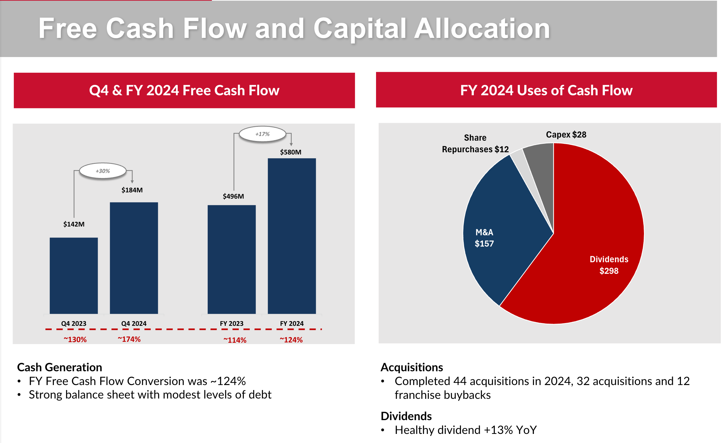 In 2024, revenue grew to $3.3 billion, and Rollins converts nearly all of the Operating Cash Flow to Free Cash Flow.