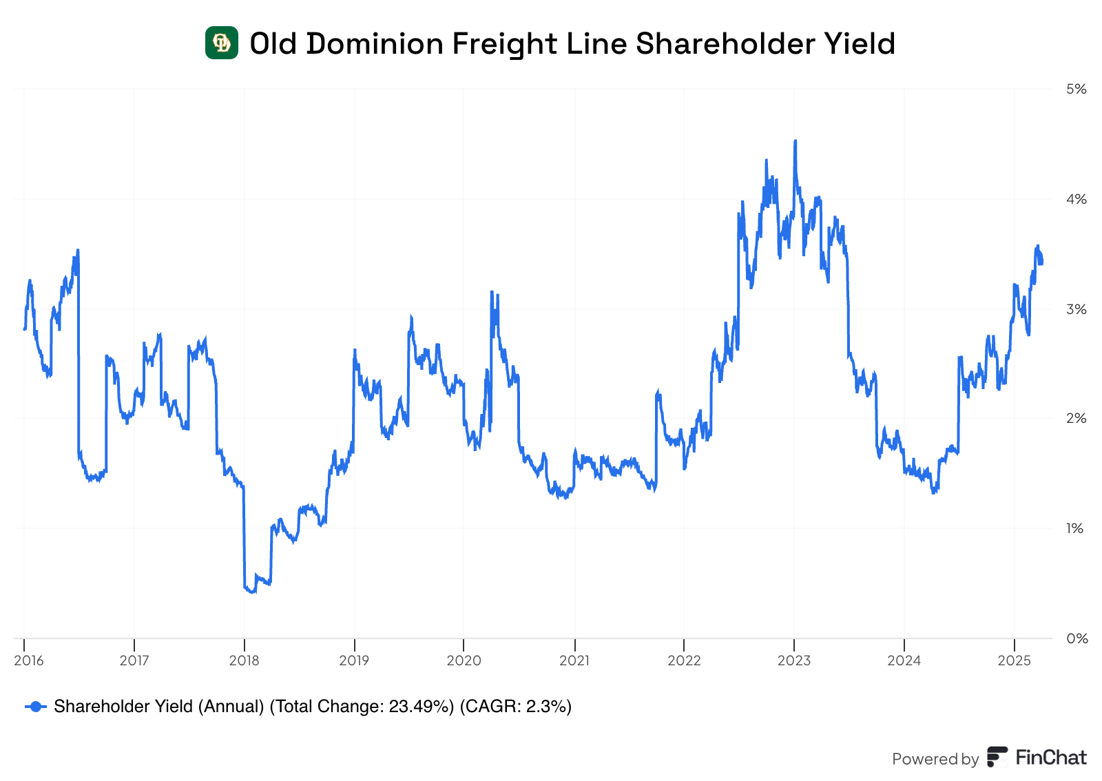 ODFL tends to spend more in buybacks than dividends, so I’ve charted Shareholder Yield - and they’re a quality company trading at a higher yield than average.