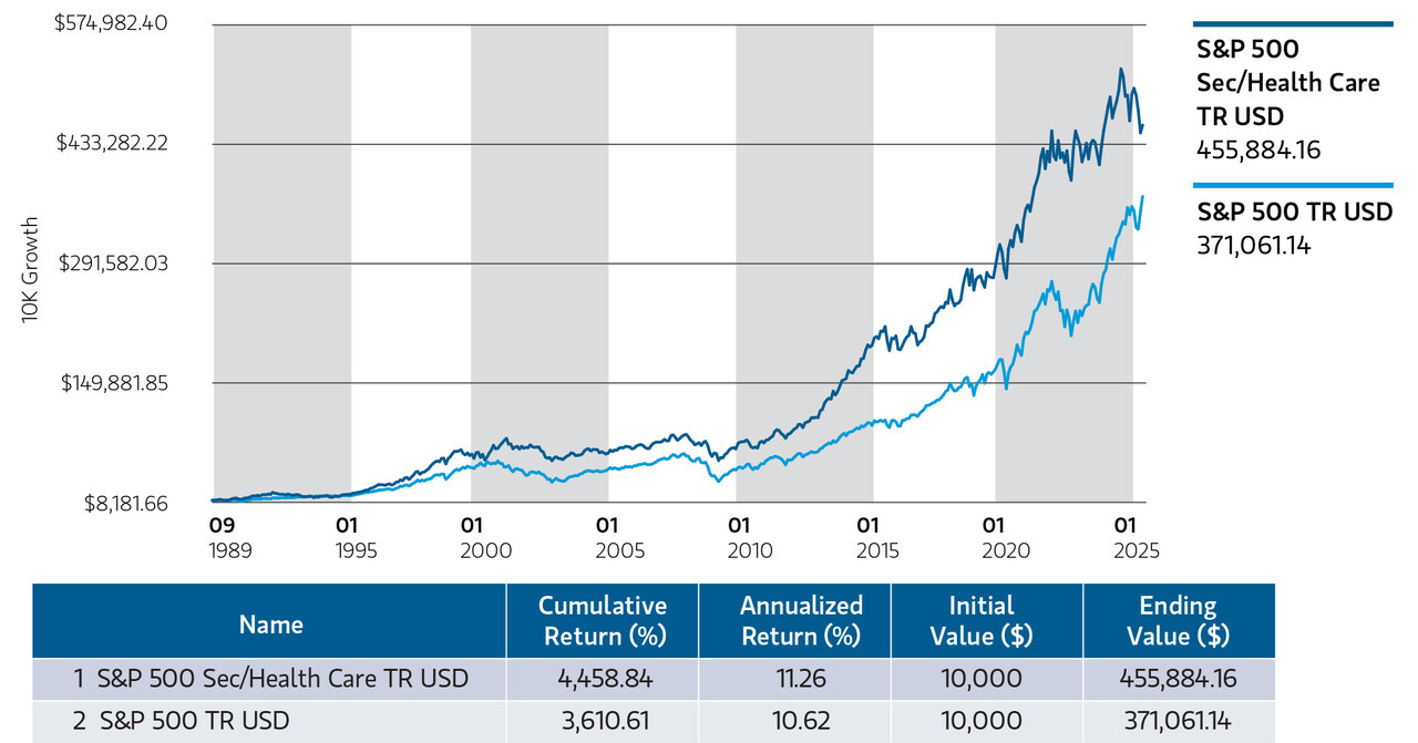 Since 1989, the S&P 500 Health Care Index has delivered 11.3% annualized returns, outpacing the broader market.