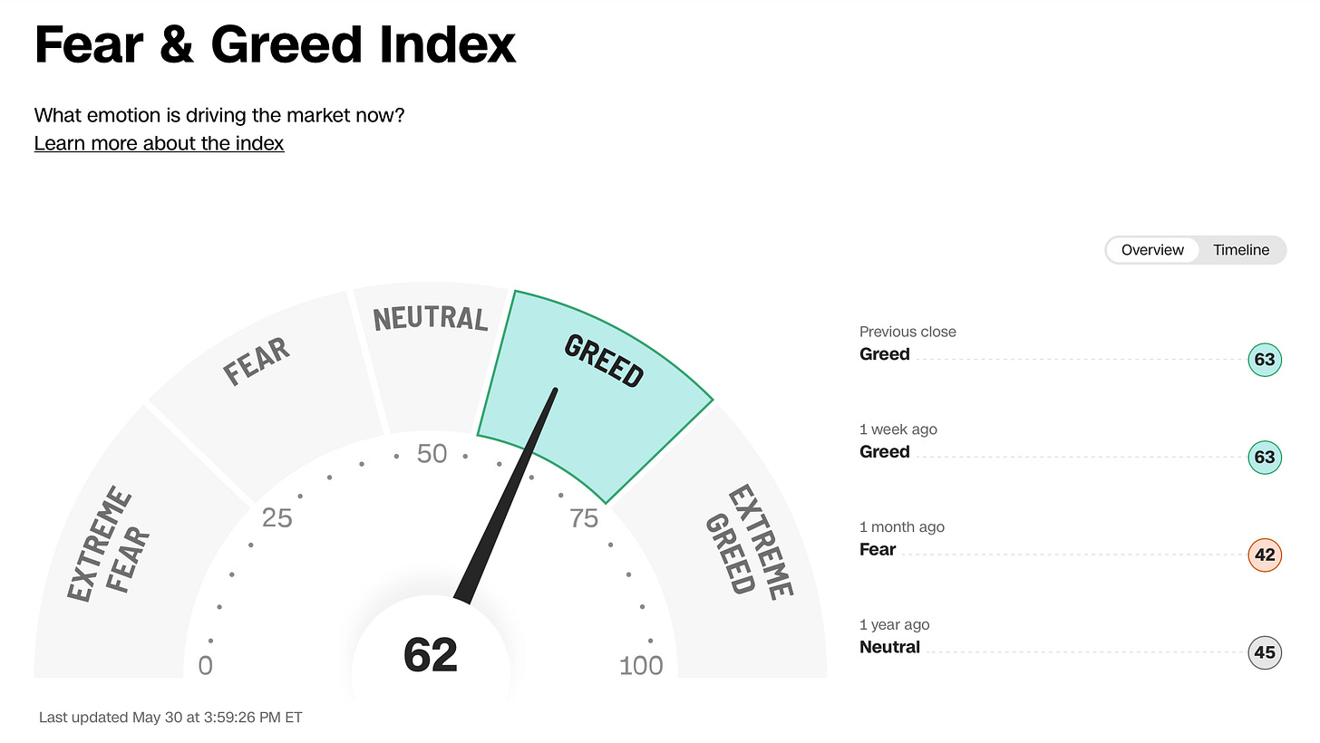 The Fear & Greed Index indicates that we ended May in ‘Greed’ Mode.
