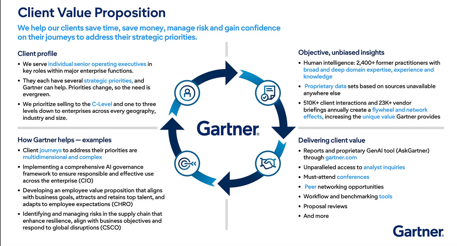 Scale: With over 2,400 experts and 13,000 customers, Gartner is significantly larger than its direct competitors.