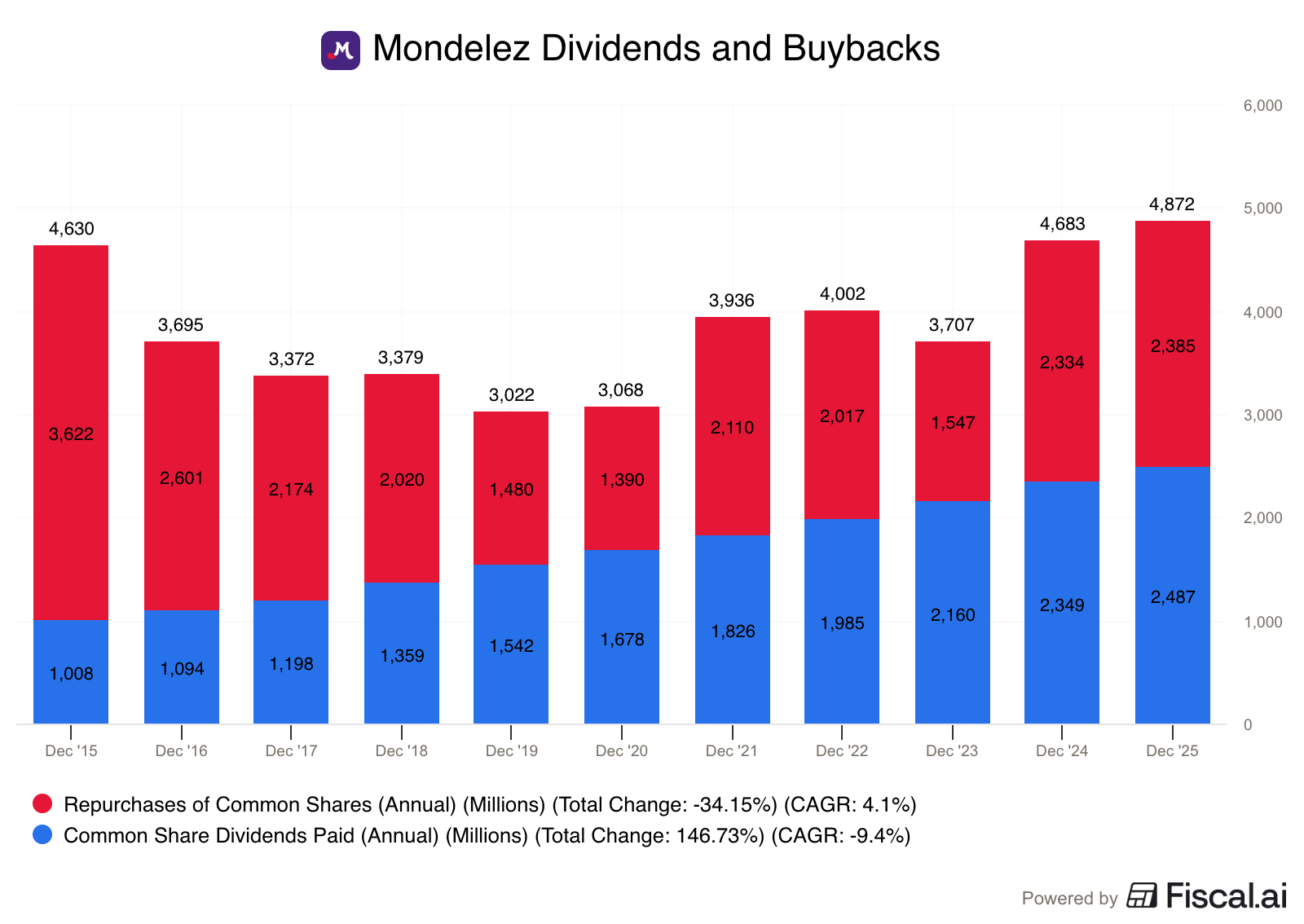 In 2025, they returned nearly $5 billion to shareholders, split fairly evenly between dividends and buybacks.