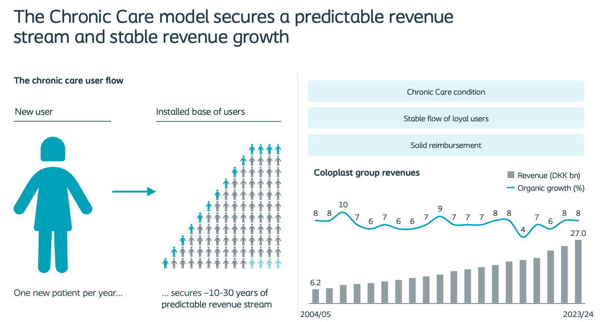 Sticky customer relationships: once a patient uses Coloplast’s products, switching is difficult.