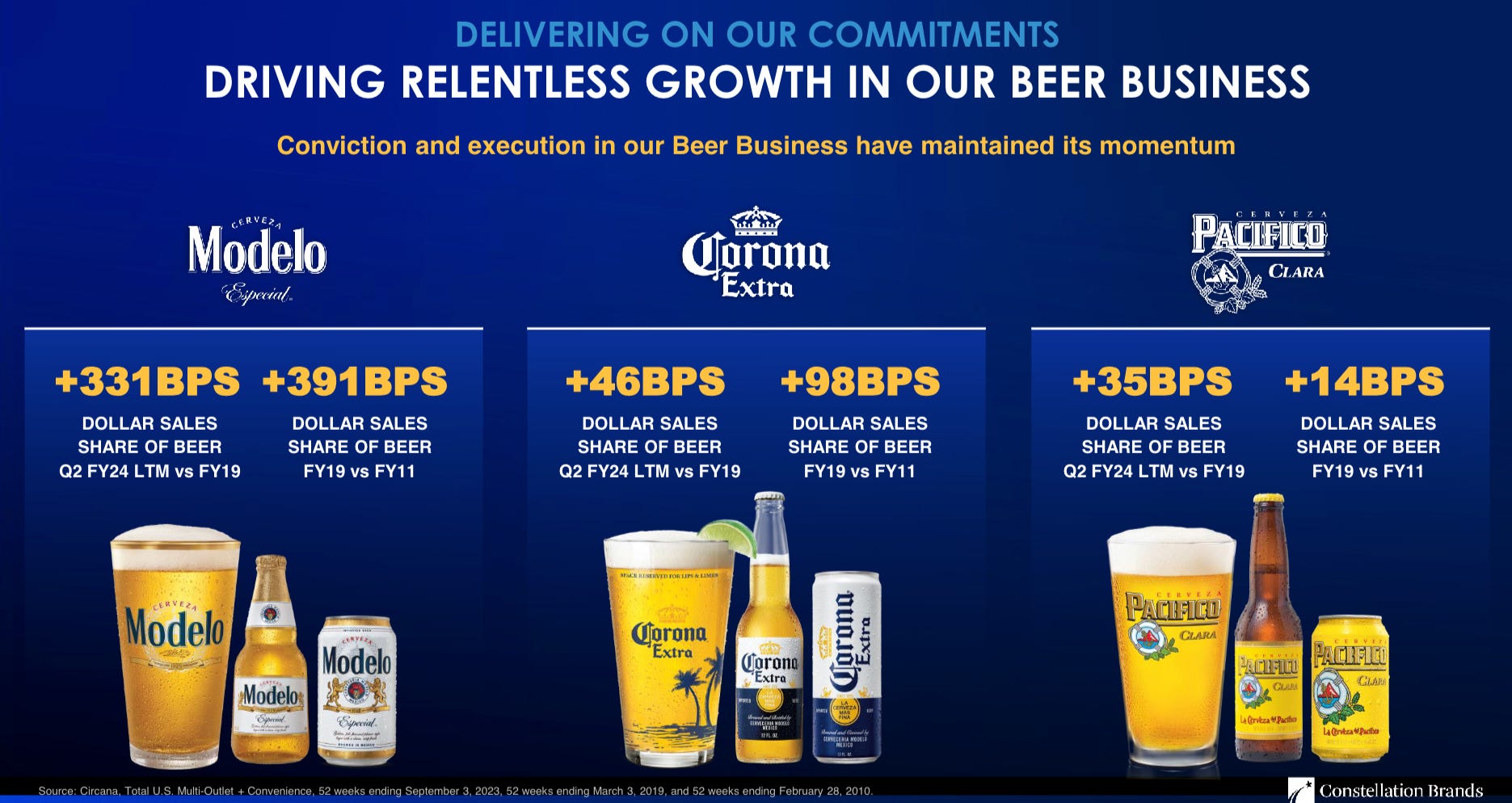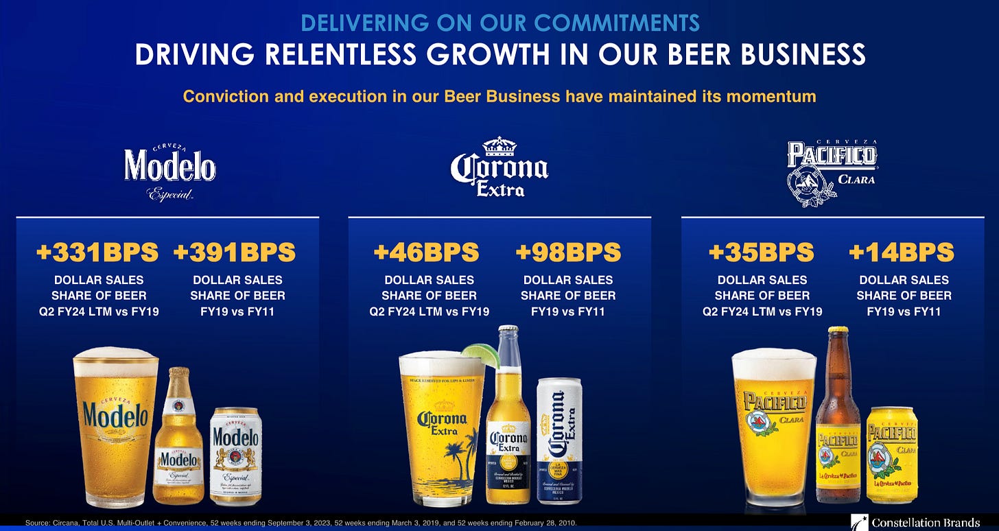 They sell popular alcoholic drinks like Corona, Modelo, and Robert Mondavi wines. Constellation leads the market for imported beer in the U.S. and also sell many spirits and wines.