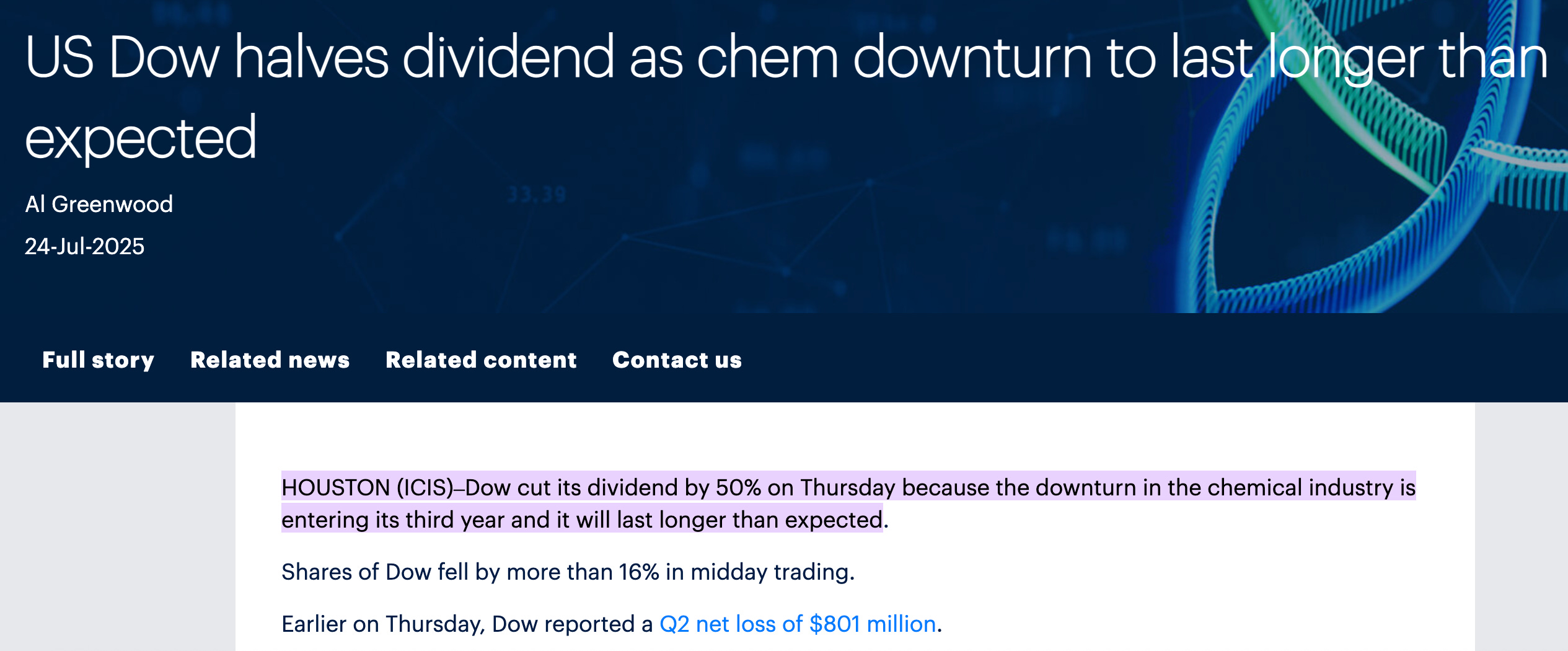 The chemicals market is indeed going through a rough time. Eastman Chemical got whacked down recently and LydondellBassell can't seem to catch a break either.