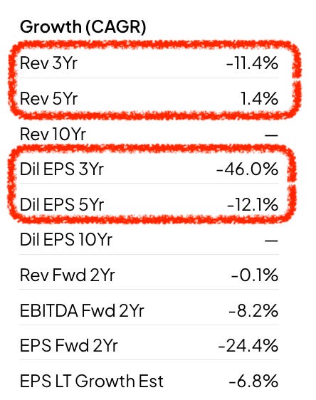 Negative revenue growth over the past 3 years, and growth that didn’t even keep pace with inflation over the past 5