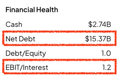 EBIT/Interest of 1.2 means Dow is spending almost all of their earnings on interest