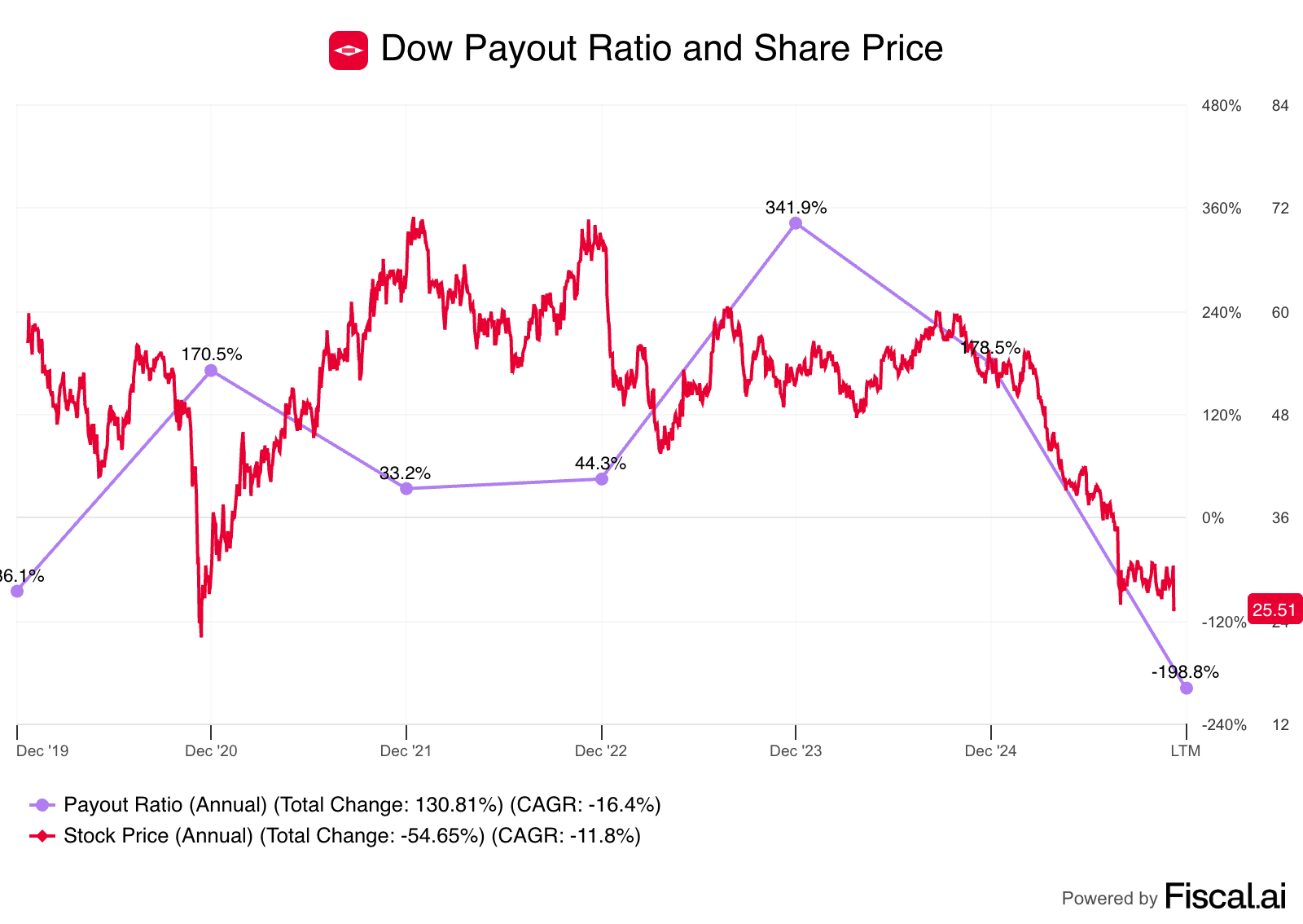 Dow spent 2 years (2023 and 2024) with a Payout Ratio well over 100%, and the share price stayed flat.