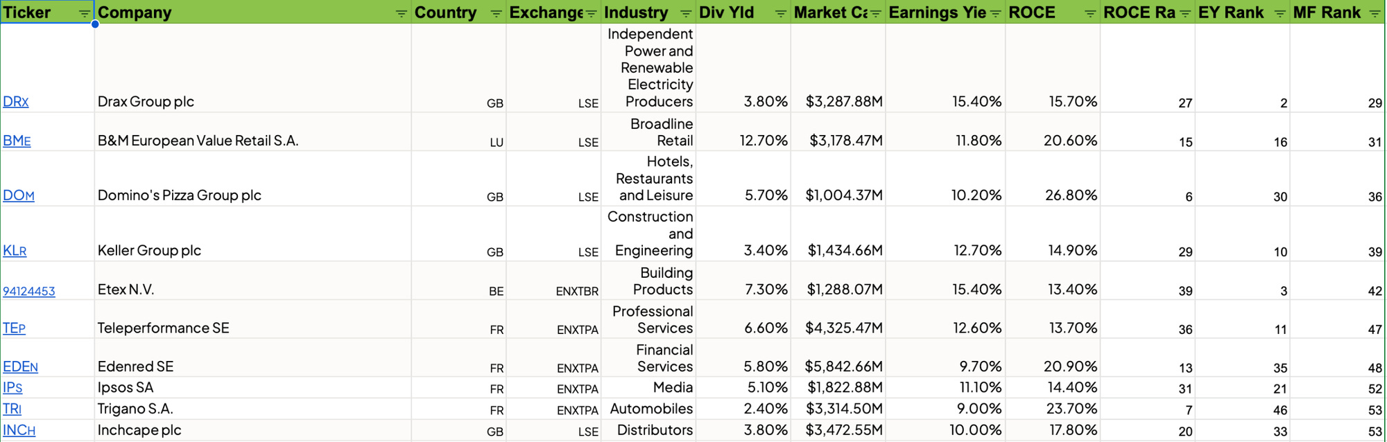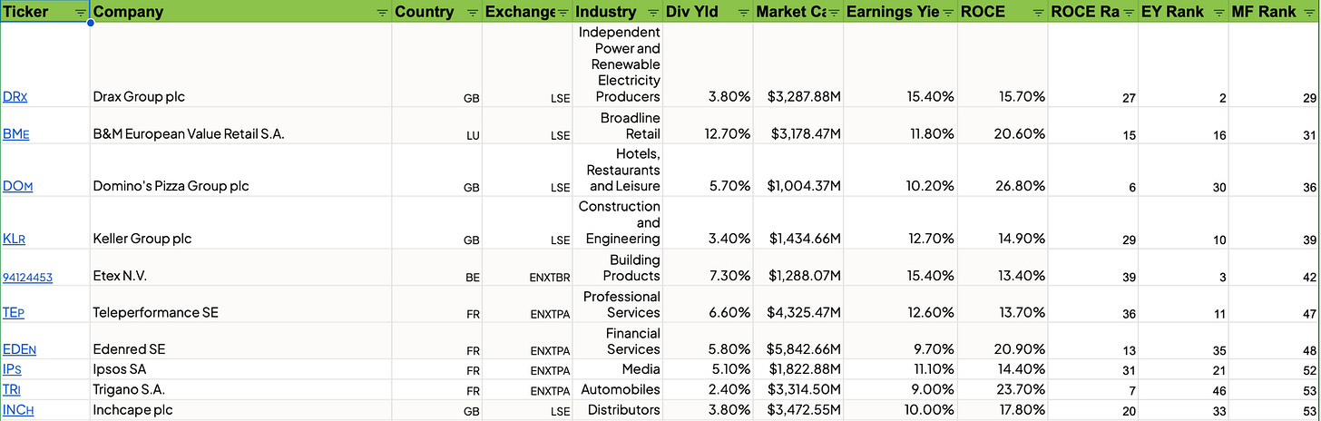 Here are the top 10 results from the latest Magic Formula Europe screen: