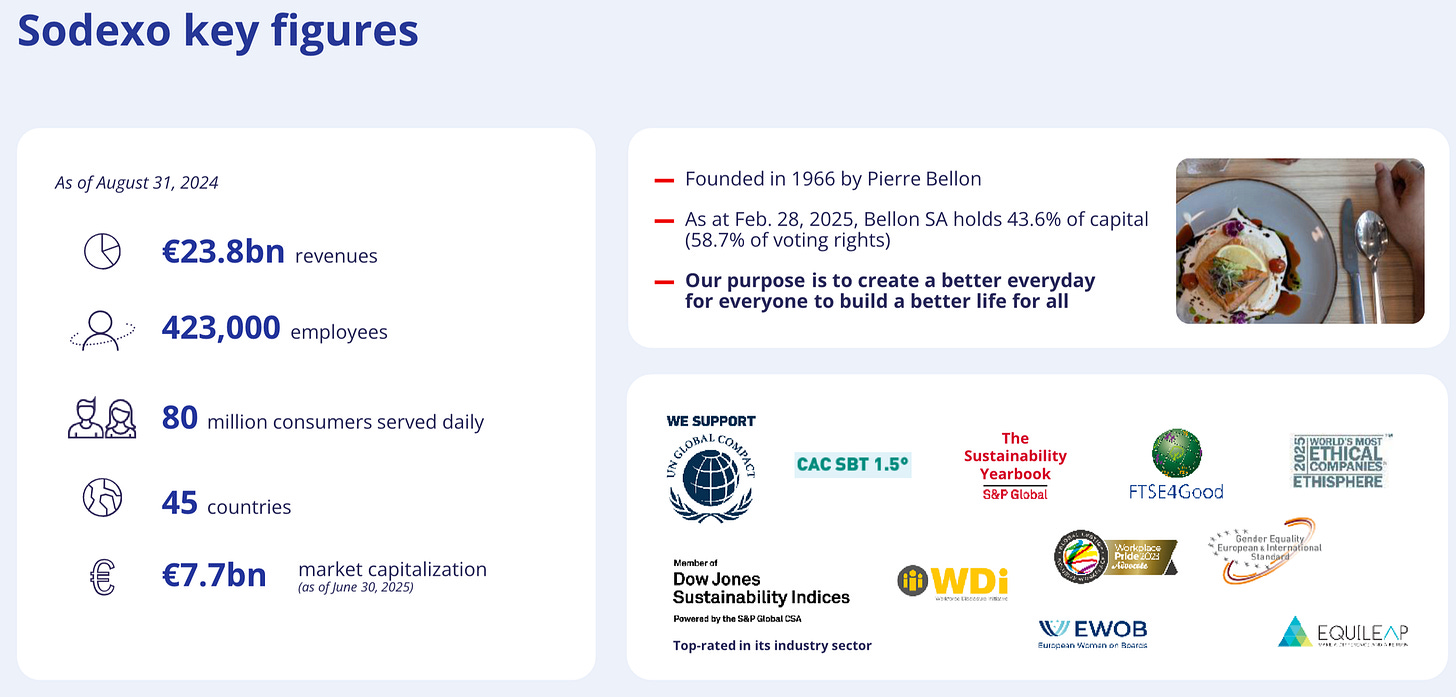 Sodexo provides food services and facilities management to businesses, schools, hospitals, and government clients around the world.