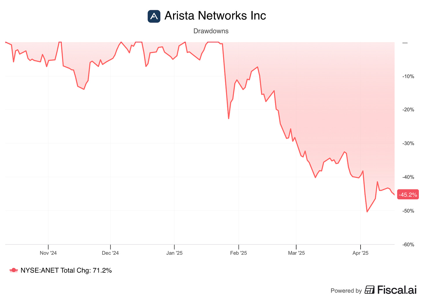 Arista Networks (ANET) fell 45% in April, but has since recovered most of it.
