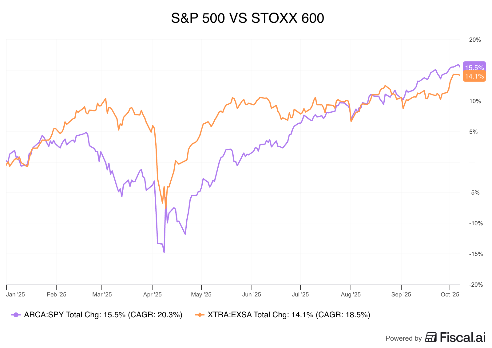 The year began with European stocks outperforming the S&P 500. America has caught up, but both indexes have done very well so far this year: