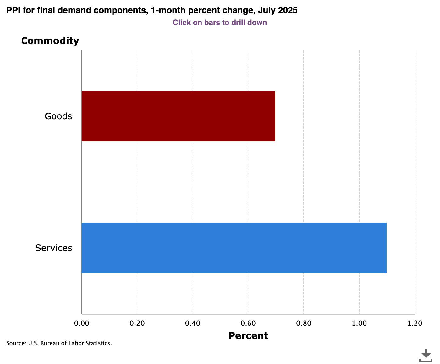 From July 2024 to July 2025, PPI rose 3.3% (vs. 2.5% expected).