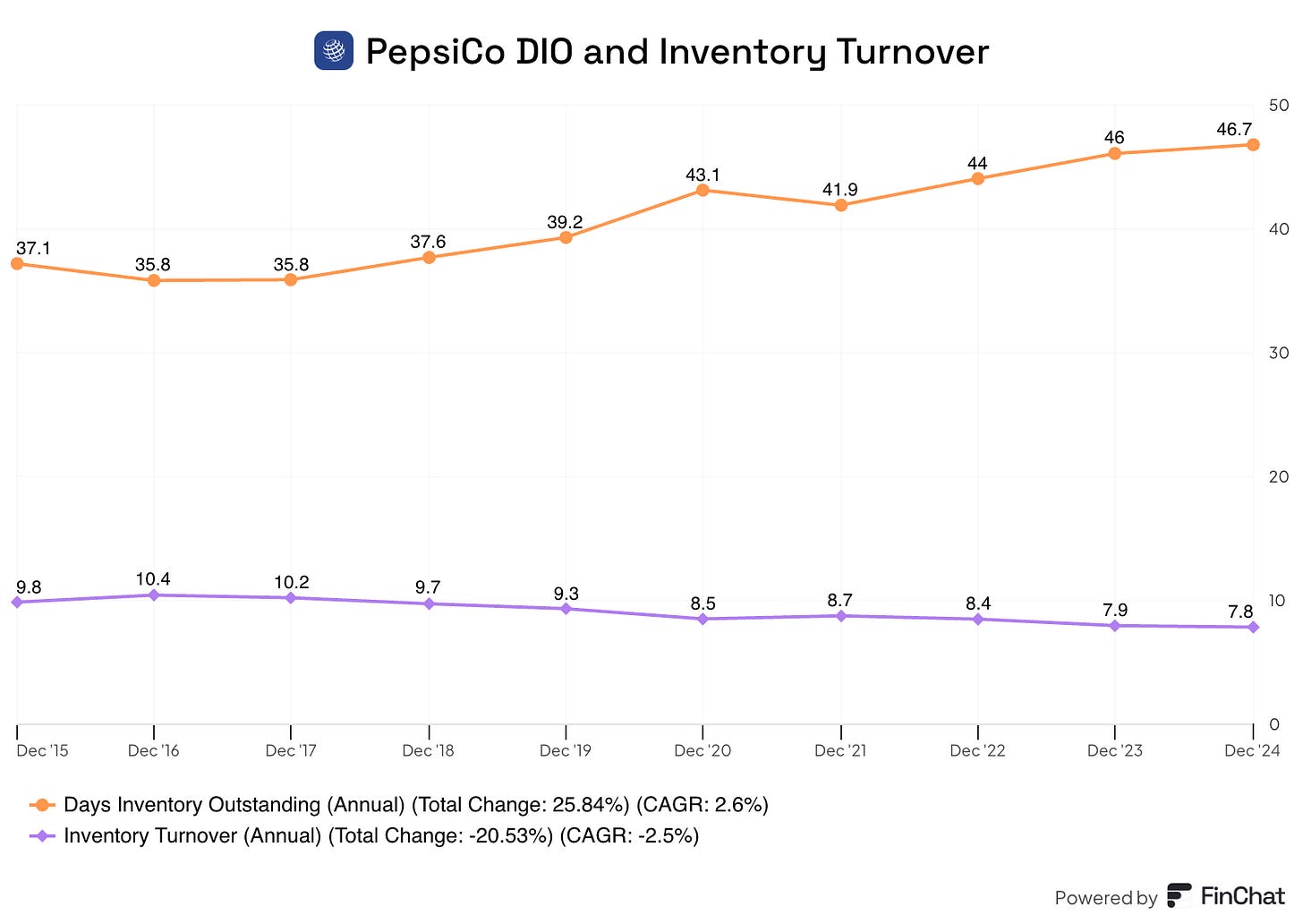 Pepsi shows an increasing DIO and a slowing Inventory Turnover, confirming that Pepsi’s sales are slowing.