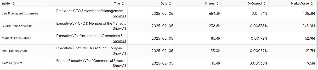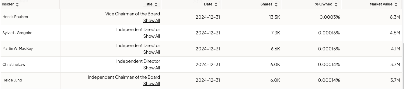 There is also heavy insider ownership, with former CEO Lars Jørgensen owning more $400M USD in shares, CFO Karsten Knudsen owning $148M USD, and various VP’s owning significant sums as well.
