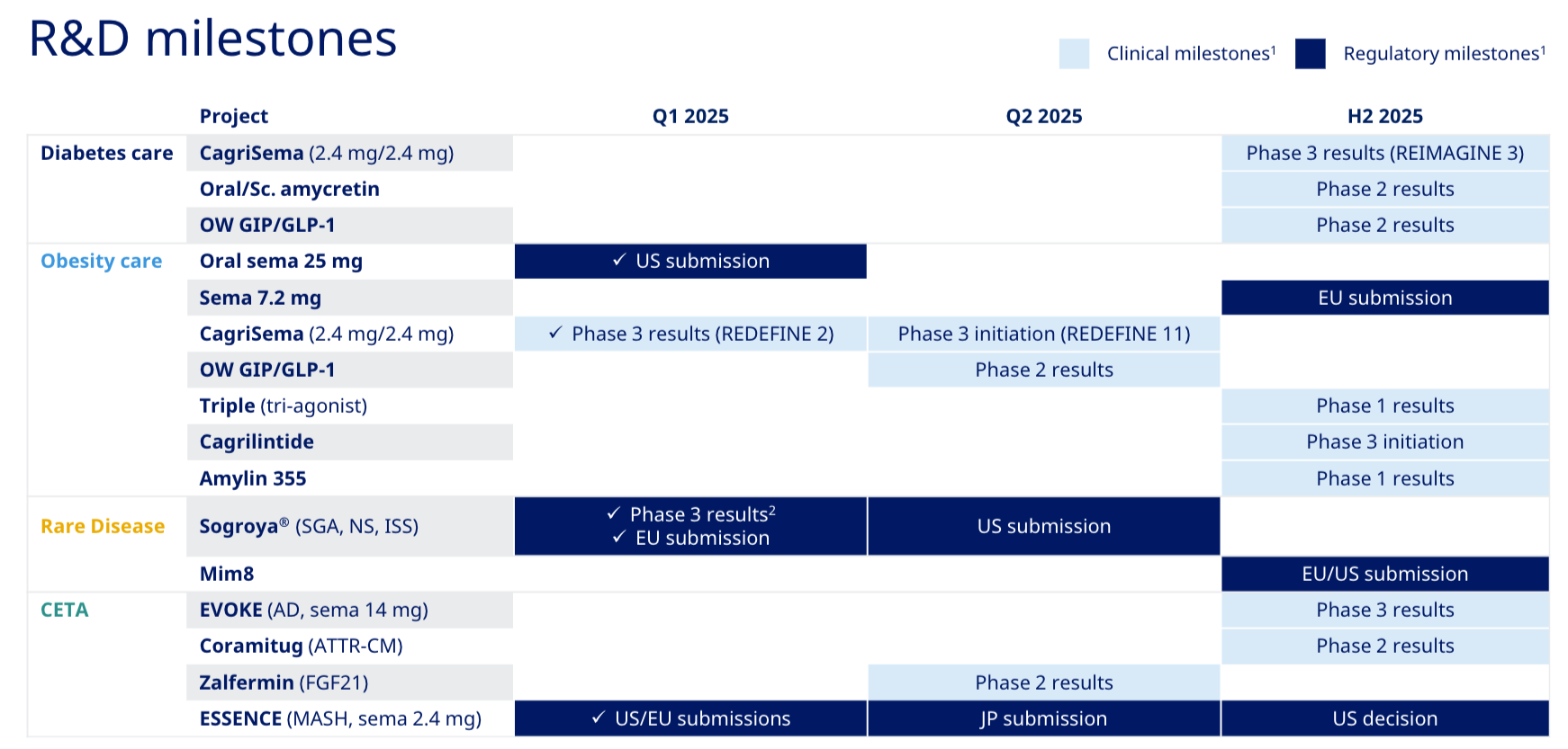 CagriSema isn’t the only drug in Novo’s pipeline - they’re also working on Amycretin, which is a simpler, single molecule that targets the same GLP-1 and amylin receptors as CagriSema. In January 2025, early-stage trial results showed up to 22% body weight loss over 36 weeks, surpassing Lilly’s Zepbound (21%) at a similar time point. Phase II and III trials should begin next year and the drug could be on the market by 2029/2030.