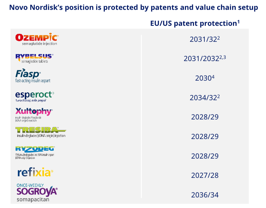 With so much revenue coming from Ozempic and Wegovy, patent expiration is a big risk for Novo Nordisk. The patents expire in 2031/2032 and revenue from GLP-1 medications will likely drop significantly once generic competition comes on the market.