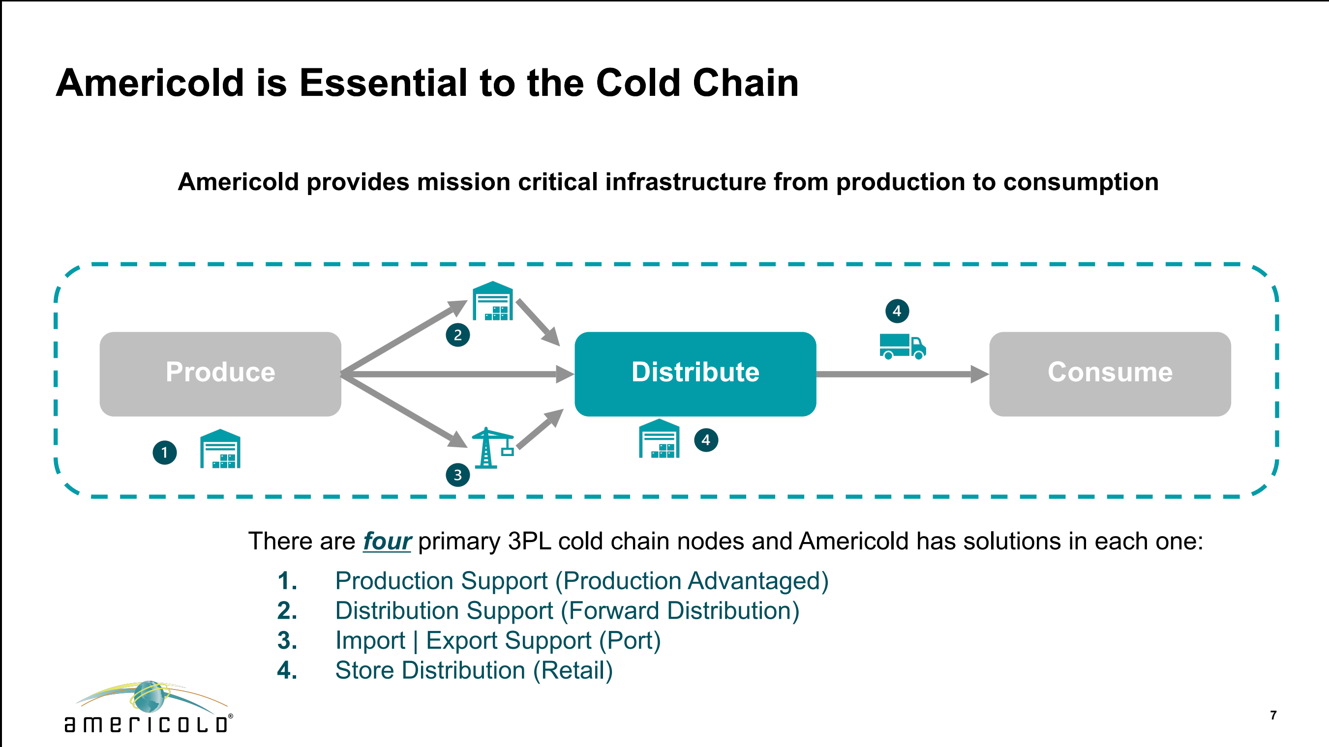 Americold has facilities in every key node of the supply chain: right next to food production plants, in major distribution hubs, and at ports.