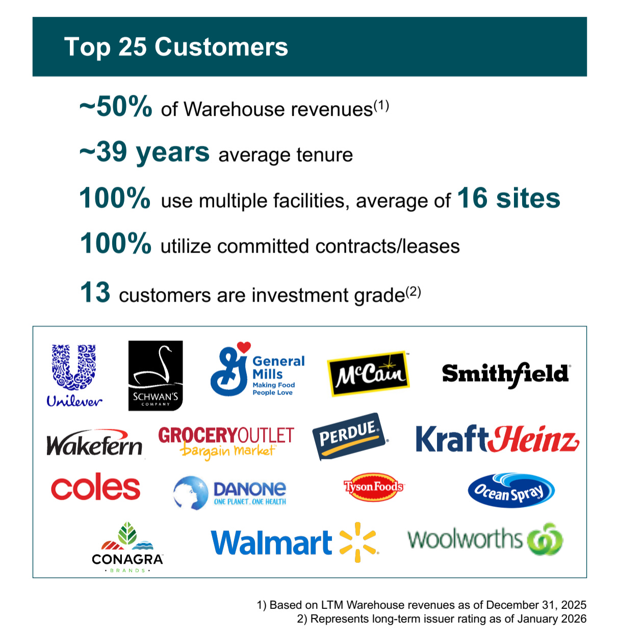 The top 25 customers account for more than 50% of warehouse revenue, and these relationships are very sticky, averaging 39 years.