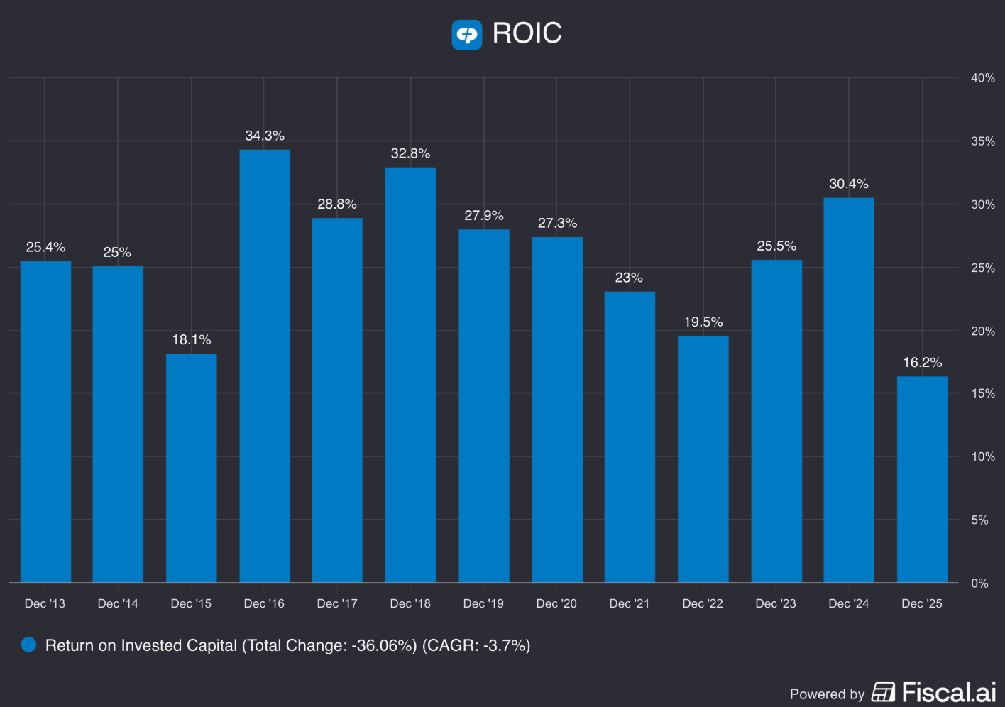 Colgate has consistently high ROIC numbers, showing us that management allocates capital well.
