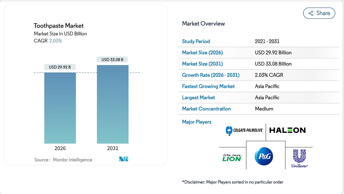 The market for consumer goods like toothpaste is slower growing, projected around 2% yearly growth.