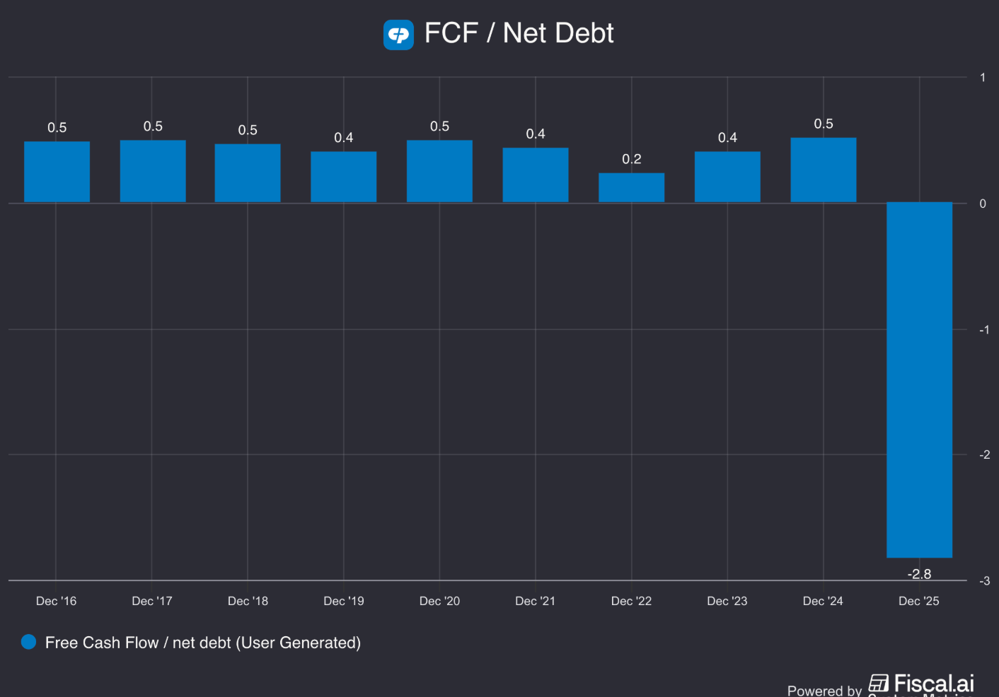 The unusual FCF to net debt figure is due to a one-time accounting impact.