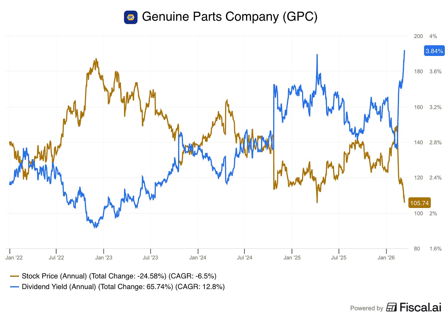 Just look at the difference between the dividends and price for Genuine Parts Company.
