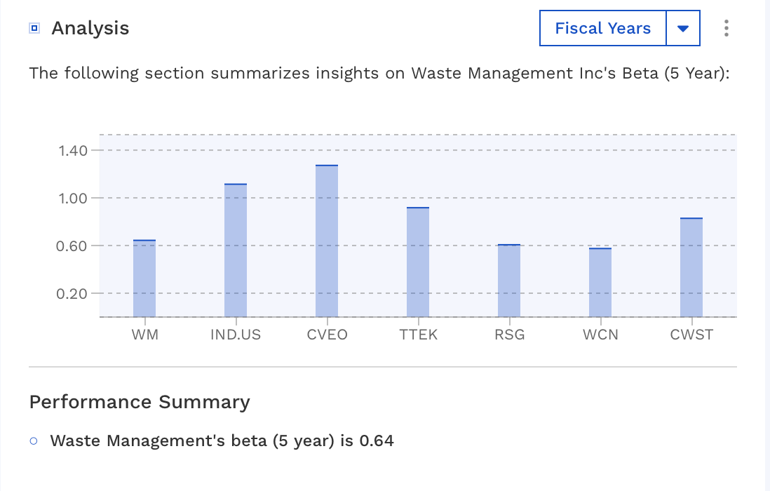 We can look at beta to see that WM’s volatility is lower than the S&P 500. Beta measures how much a stock’s price moves compared to the overall market.
