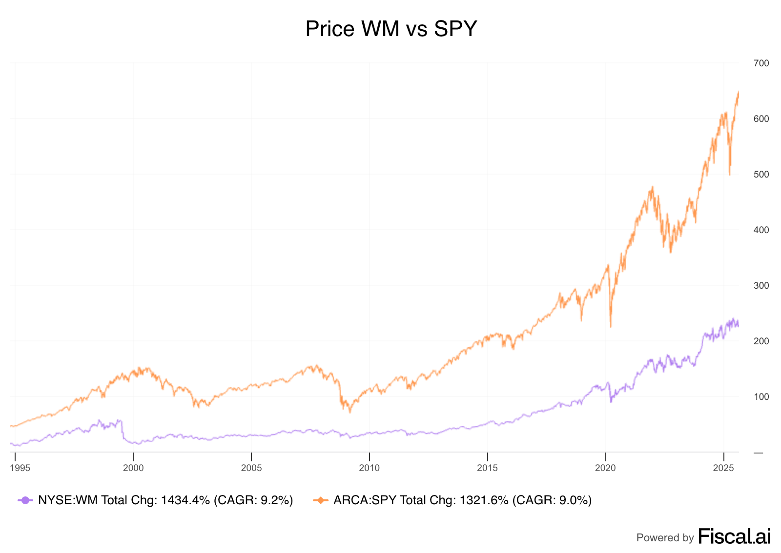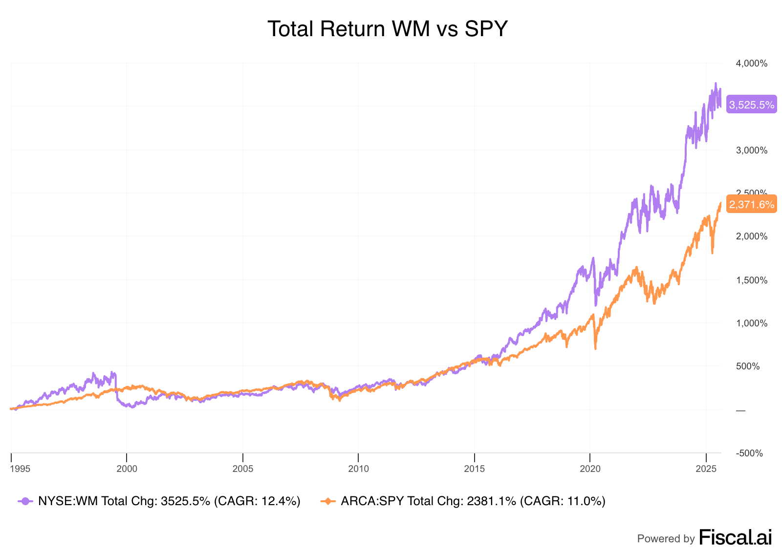 But once you include dividends and buybacks, WM’s total return has far outpaced the market.