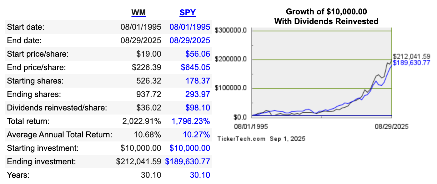 Since 1995, WM’s price return alone has actually lagged the S&P 500.