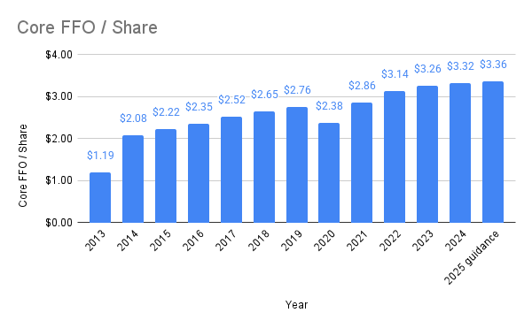 Over the past 3 years, the company has grown revenue by 6% per year and FFO per share by around 3% each year.