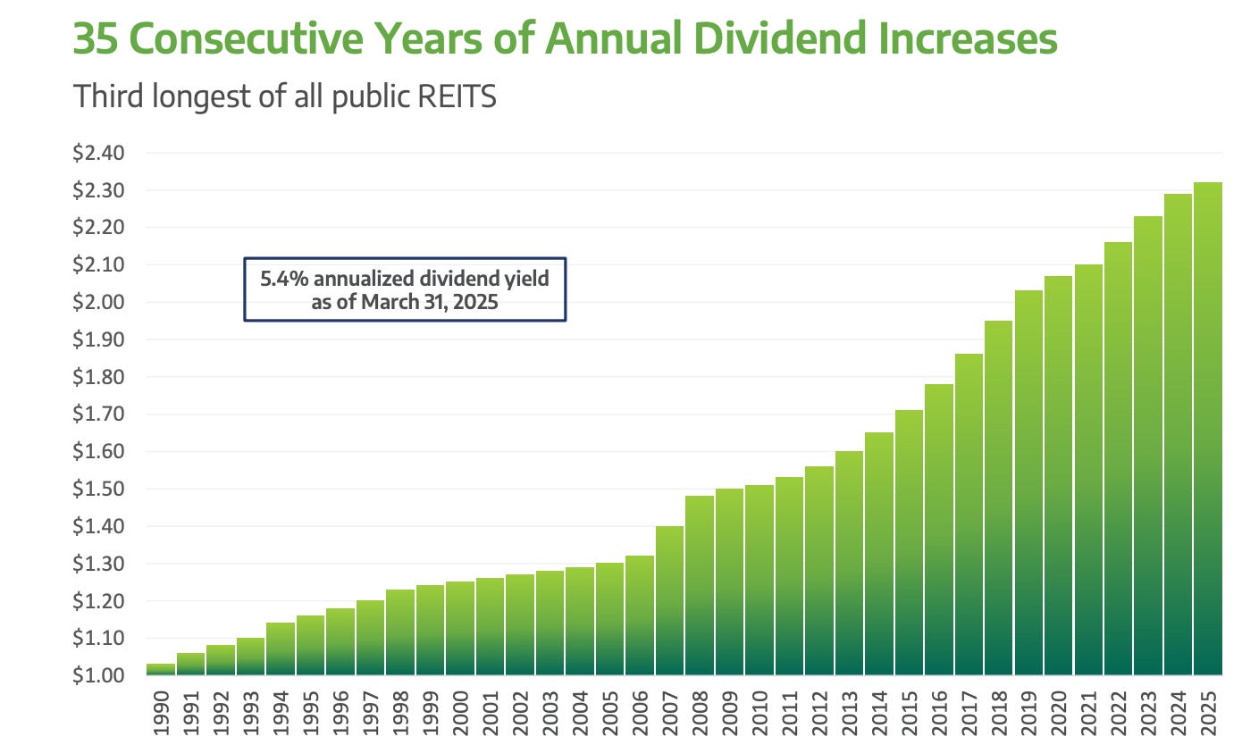 For 35 straight years, it has raised its dividend, while maintaining an occupancy rate that rarely dips below 98%.