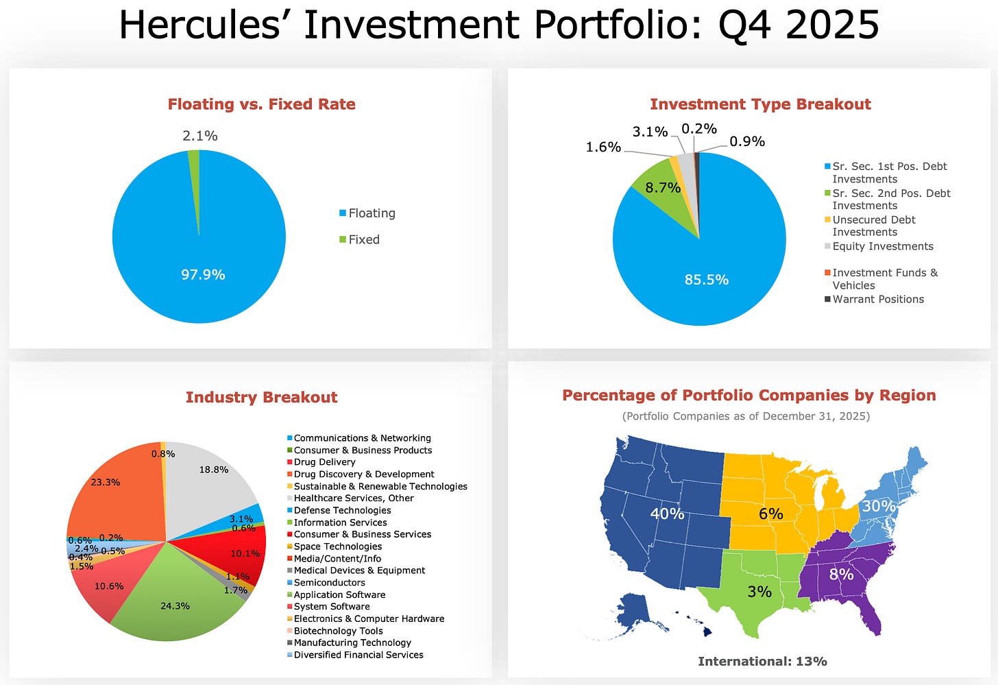 Hercules is even more concentrated than Sixth Street, but they protect themselves with a lot of short term first lien loans, and the potential upside that comes with warrants and equity.