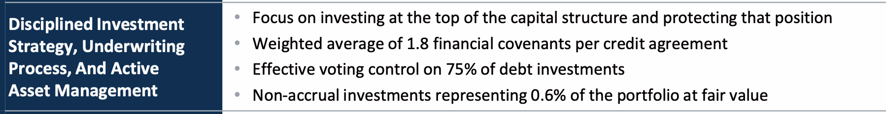 They tend to have first lien positions, and voting control, which means if a borrower needs to change its loan terms or restructure, TSLX's vote is often required, giving them massive leverage.