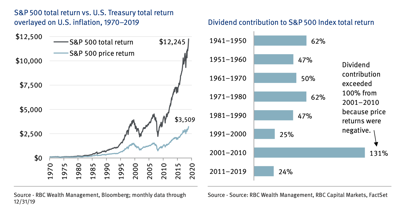 Dividends are a large part of the total return of the S&P 500 in every single decade.