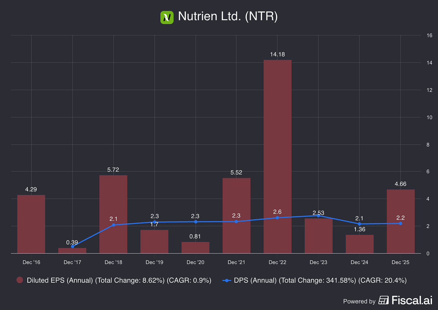 Nutrien is a cyclical company, so there are periods where the earnings go way up, but the dividend doesn’t follow.