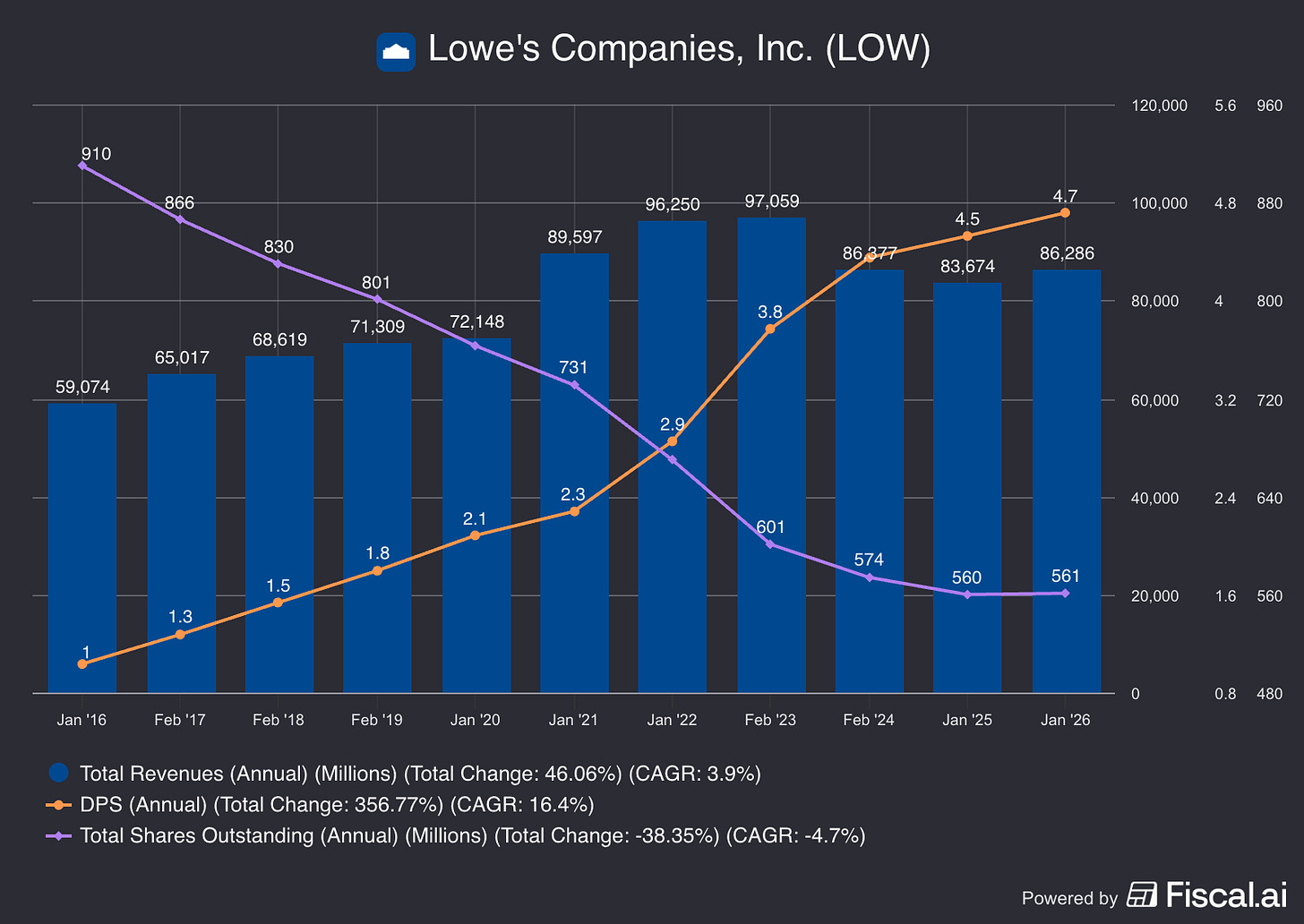 That’s because Lowe’s has reduced the share count by almost 40% over the past 10 years.