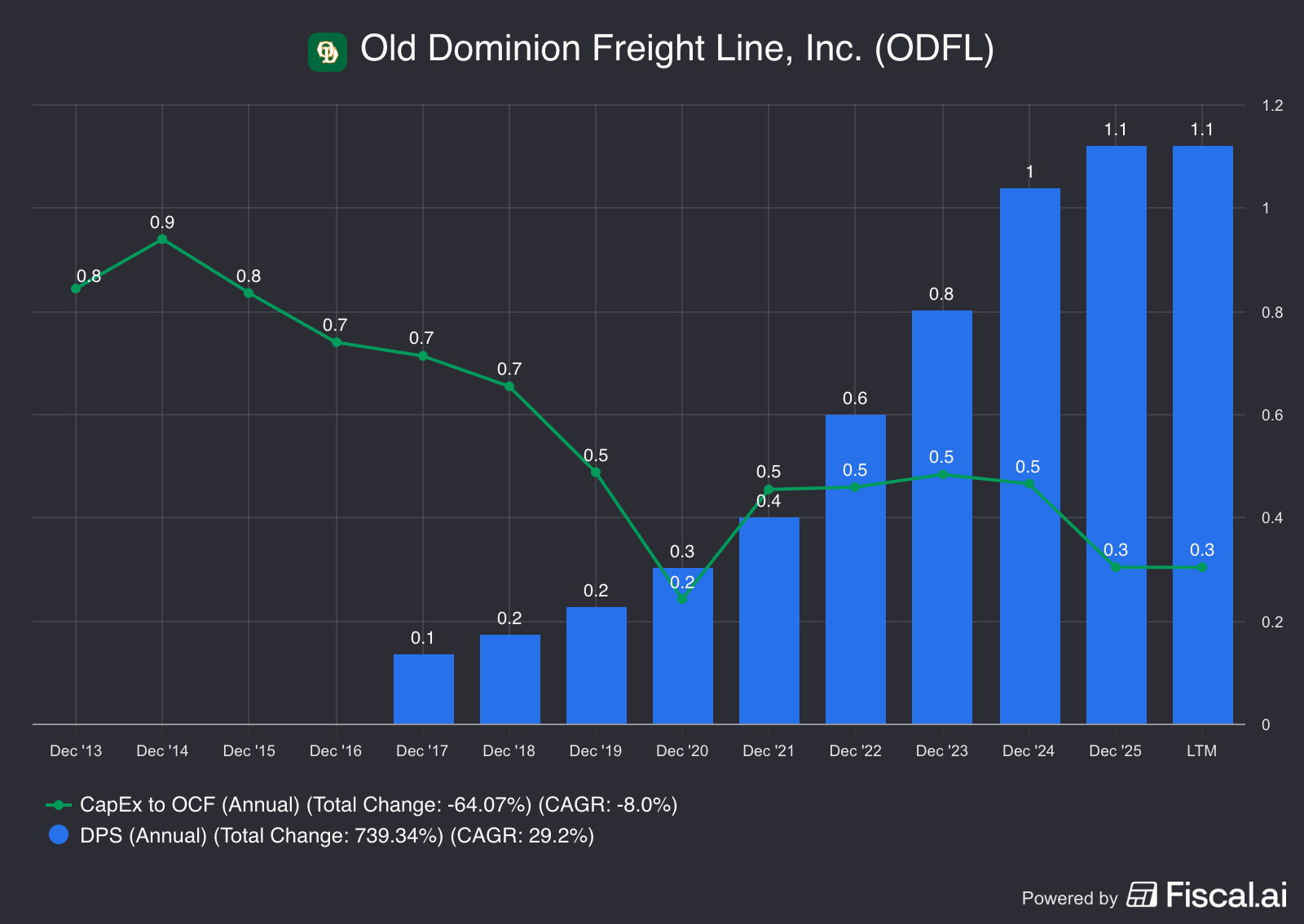 As the network got built out, the amount of profit spent on growth dropped, and Old Dominion was able to initiate a dividend in 2017.