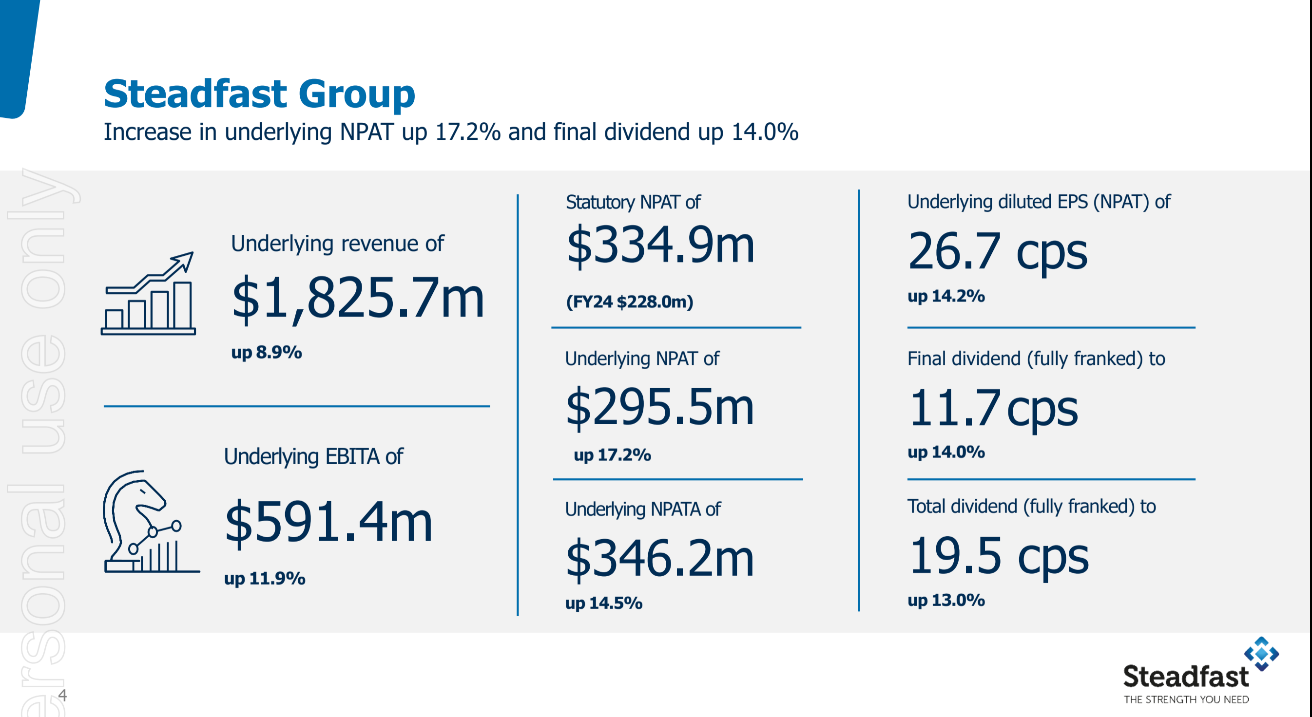 Steadfast is the largest general insurance broker network in Australasia, earning fees and commissions by connecting businesses with insurance underwriters.
